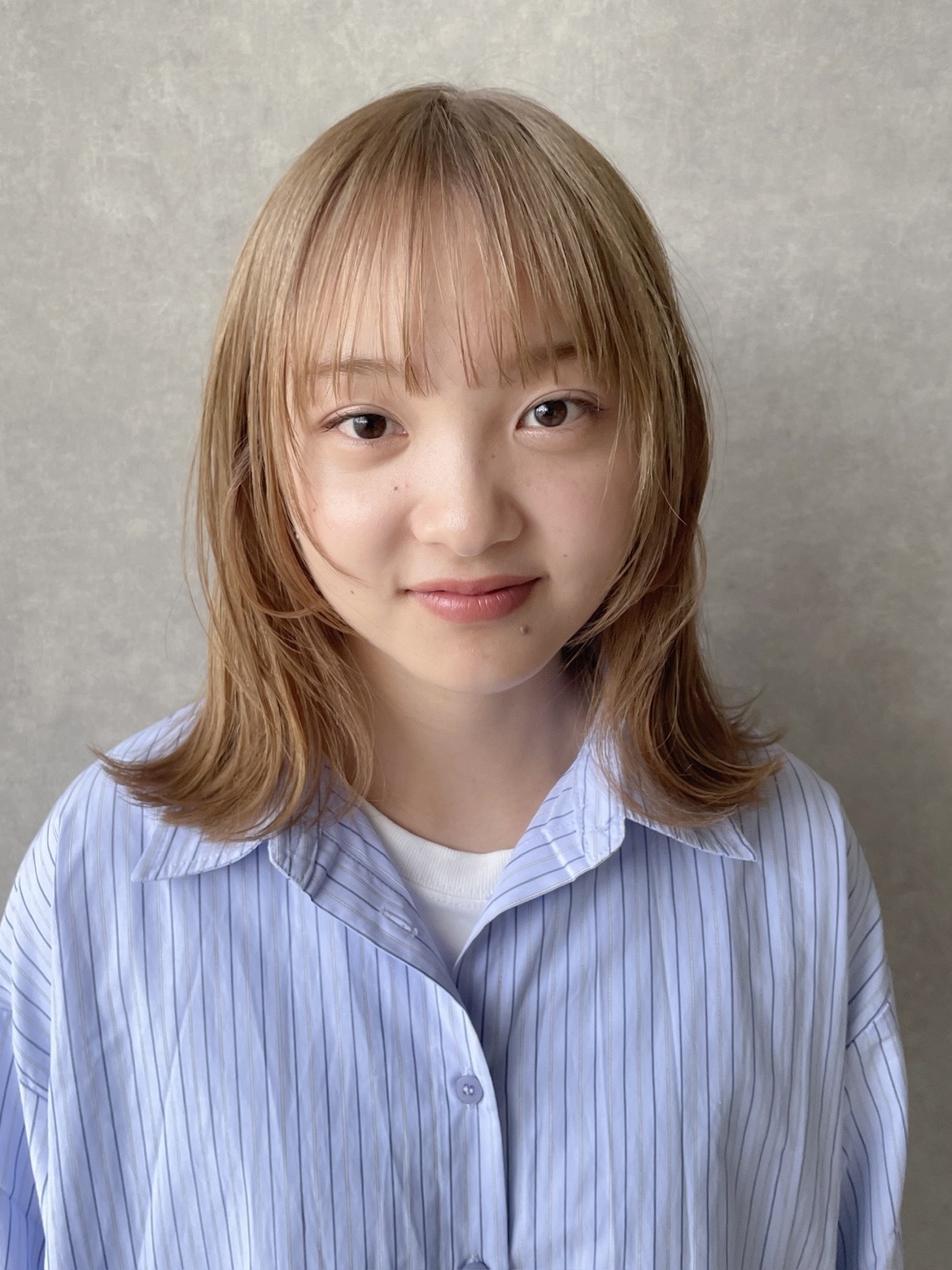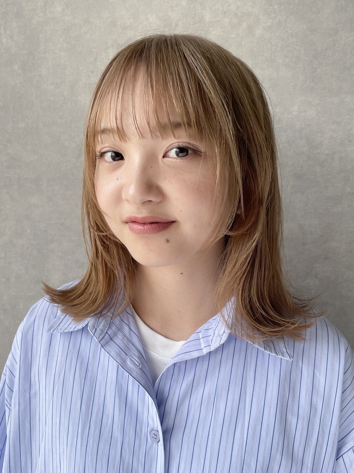 顔周りレイヤーで抜け感を出しながら、光に透けると柔らかさのある透明感ベージュで似合わせています。